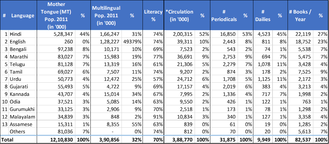 | 12 | Malayalam | 3,358 | 4% | 11,815 | 1.1% |