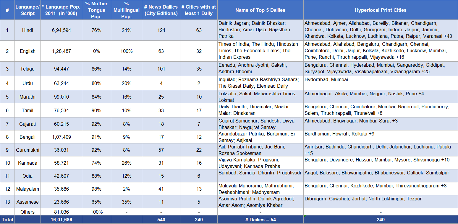 Although there are over 800 cities/state capitals, and 9,389 cities overall, hyperlocal print dailies are available in only 240 cities.