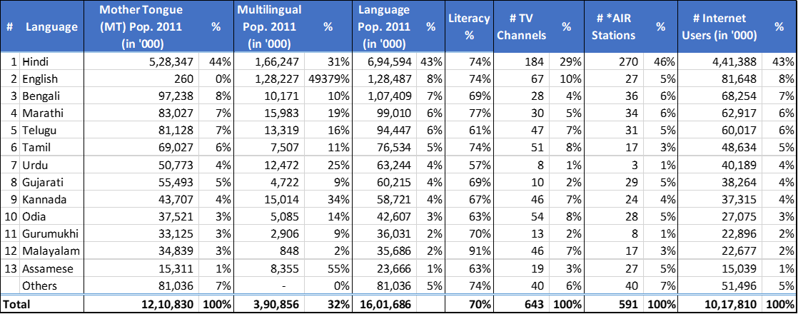 * Language population is the aggregation of Mother Tongue population and Multilingual population