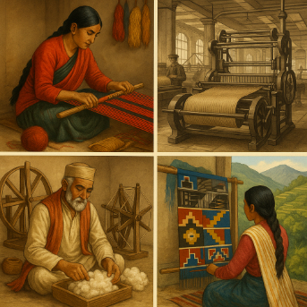 उत्तराखंड की वस्त्र-कला की जड़ें बहुत गहरी हैं! यह एक अत्यंत प्राचीन परंपरा है। प्राचीनतम समय में भी, यहाँ के समुदायों को अपने वस्त्रों और अन्य उपयोगी सामग्रियों के लिए हस्तशिल्प तकनीकों पर ही निर्भर रहना पड़ता था। बुनाई की तकनीकें, यहाँ की मूल जनजातियों की घुमंतू जीवन शैली और व्यापार मार्गों से होने वाले सांस्कृतिक आदान-प्रदान के साथ विकसित हुईं। इस प्रकार, इतिहास के विभिन्न कालखंडों में, पड़ोसी क्षेत्रों – जैसे तिब्बत, नेपाल और गंगा के मैदानी इलाकों – के तत्वों ने उत्तराखंड की बुनाई तकनीकों को एक नया रूप दिया। इन विभिन्न प्रभावों के संगम ने उत्तराखंड की बुनाई परंपरा में प्रयोग और नवीनता के कई अवसर खोले। उत्तराखंड के वस्त्रों के इतिहास में एक और महत्वपूर्ण मील का पत्थर 19वीं सदी में ब्रिटिश उपनिवेशीकरण था, जिसने मशीनीकृत करघों और औद्योगिक उत्पादन की तकनीकों को बढ़ावा दिया।