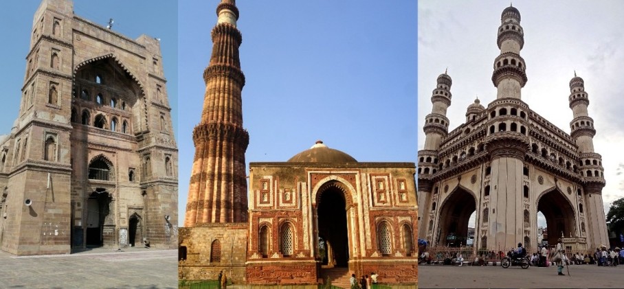 उदाहरण के तौर पर कुतुब मीनार 73 मीटर ऊंची एक विशाल मीनार है, जिसे 12वीं शताब्दी के अंत में दिल्ली के पहले मुस्लिम शासक कुतुब-उद-दीन ऐबक ने बनवाया था। इसके अलावा अलाई दरवाजा 14वीं शताब्दी में खिलजी राजवंश द्वारा निर्मित एक और प्रतिष्ठित स्मारक है और इसमें जटिल नक्काशी और सुंदर सुलेख शामिल किये गए हैं। इसी क्रम में जामा मस्जिद भी भारत में सबसे बड़ी और सबसे प्रसिद्ध मस्जिदों में से एक मानी जाती है, जिसे 17 वीं शताब्दी के मध्य में मुगल सम्राट शाहजहां द्वारा बनवाया गया था।