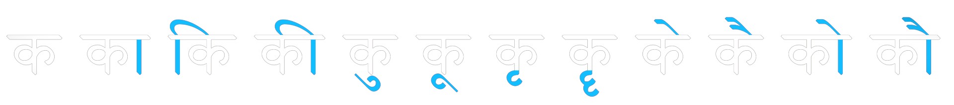 6.) शीर्ष पर क्षैतिज रेखा (शिरोरेखा): देवनागरी की सबसे पहचानने योग्य विशेषताओं में से एक, अक्षरों के शीर्ष पर क्षैतिज रेखा है। इस पंक्ति को ‘शिरोरेखा’ के नाम से जाना जाता है, और यह लिपि की एक अनूठी विशेषता है।