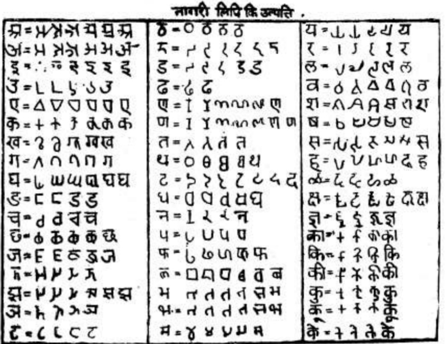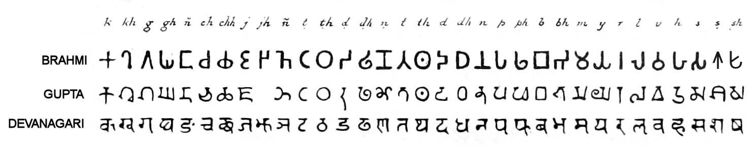 ब्राह्मी से गुप्त और देवनागरी तक के विकास को निम्नलिखित तालिका में दर्शाया गया है।