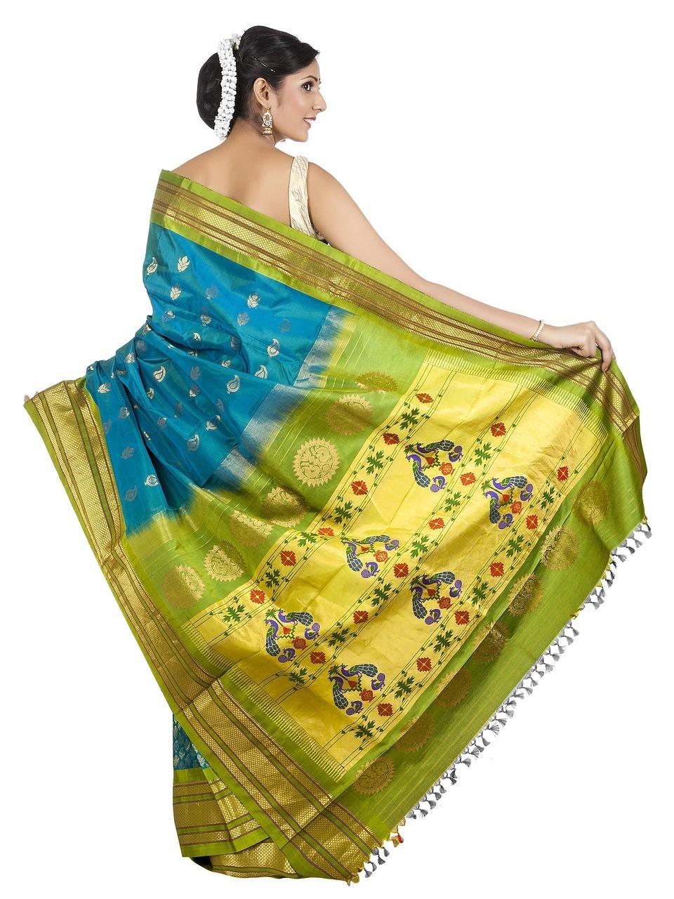 काही विद्वानांच्या मते, दुसऱ्या शतकात प्रतिष्ठान (आताचे पैठण) येथून रोमन साम्राज्यात निर्यात केले गेलेले रेशीम पैठणी असू शकते. या हातमाग साडीचे पुनरुज्जीवन झाले आहे आणि सहावारी (सहा-यार्ड) सूती आणि रेशमी पैठणी, जी फ्लाय शटल पिट लूमवर(Fly shuttle pit looms) विणली जाते, ती सामान्य आहे. सुरुवातीला ती नऊवारी (नऊ-यार्ड) म्हणून, वेगवेगळ्या समुदायांमध्ये वेगवेगळ्या शैलीत परिधान केली जात असे. चमकदार रत्नांच्या रंगात उपलब्ध असलेल्या पैठणीमध्ये हिरवी पैठणी सर्वात शुभ मानली जाते आणि ती महाराष्ट्रीयन वधूंकडून परिधान केली जाते. या प्रकारच्या साडीवर सर्वात सामान्य डिझाईन्समध्ये ‘बाणंदडी मोर’ (वर्तुळातील मोर), ‘मुनिया’ (लहान पक्षी), कमळाची फुले आणि ‘बाळगंधर्व’ (विणलेली डिझाइन) यांचा समावेश आहे.